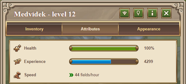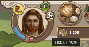 Your hero’s health (HP) is important for survival. They lose health during adventures, in battles, when there is not enough crop to feed them, or when they accumulate too much damage. You can view your hero’s current health in the hero overview (top left) and on the hero attributes page.