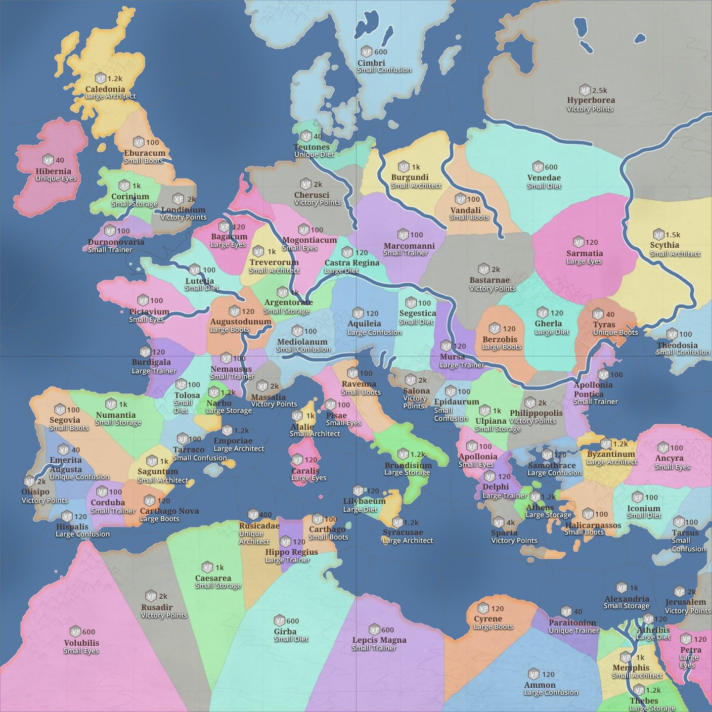 The map below shows all regions, their Victory Point (VP) values, and their Ancient Powers.