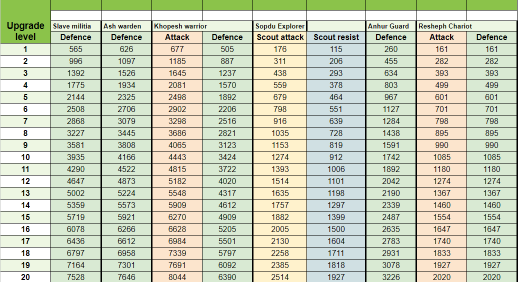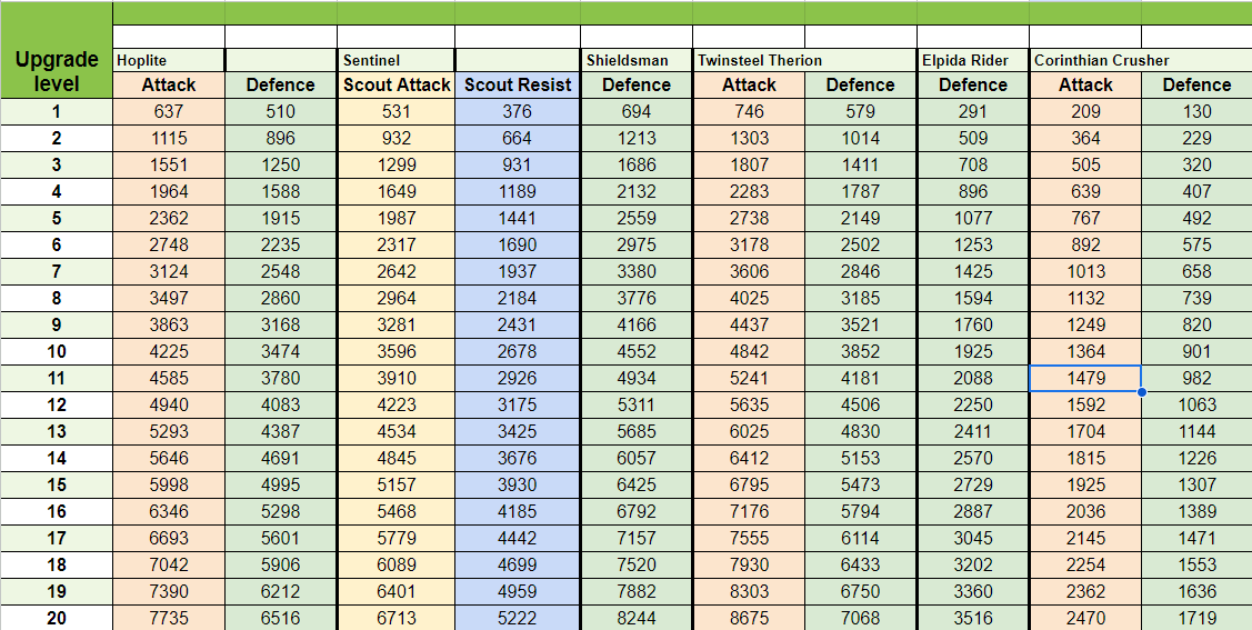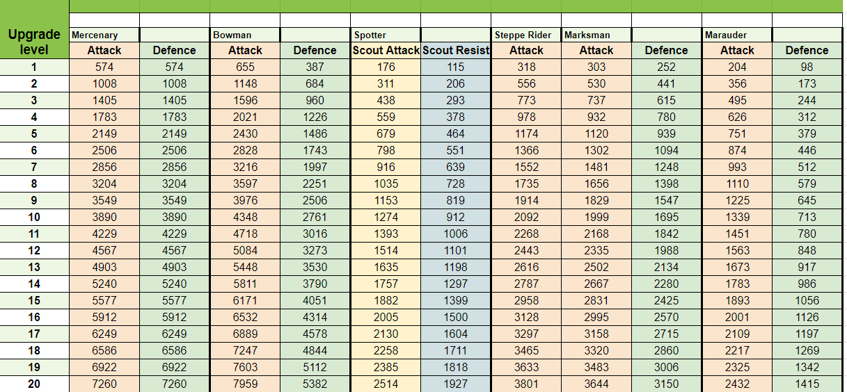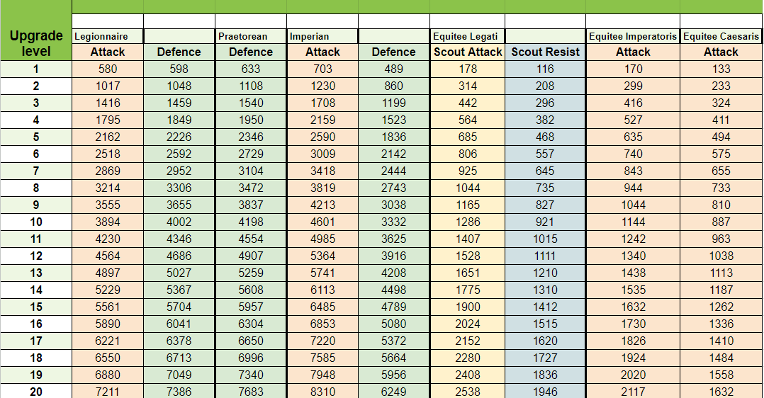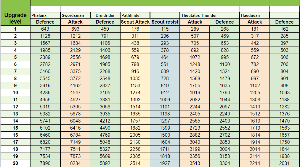 Below you will find the full upgrade efficiency tables for every tribe. Each table lists unit strength per upgrade level, allowing you to compare the benefit of upgrading versus producing new units of the same type.