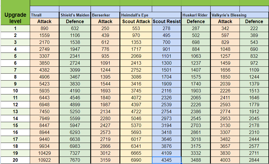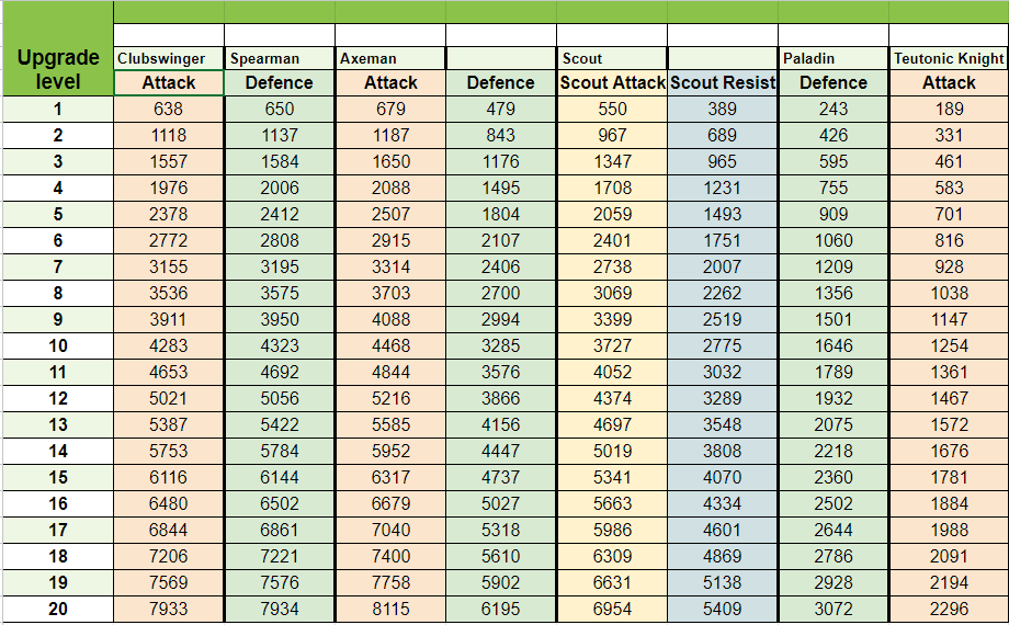 The tables in this guide show how many troops of each type you should have before upgrading becomes more efficient than training new ones.